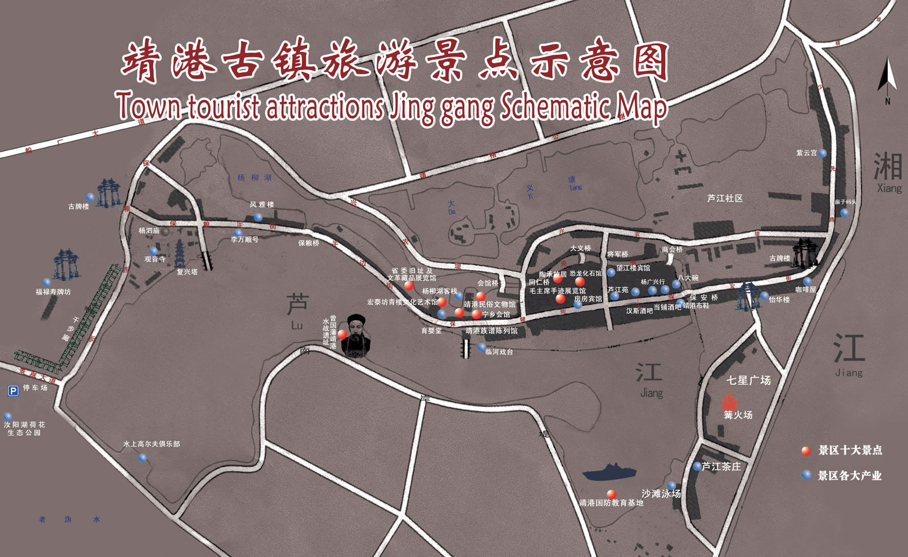 靖港,原名蘆江,地處溈水入湘江口,多洲灘,蘆葦叢生,故名。唐武德四年,內(nèi)亂頻仍,高祖皇帝李淵派大將軍李靖南下戡亂。李靖駐兵蘆江,“軍令嚴整,秋毫無犯,百姓德之,名其水曰靖港,以志不忘!庇谑牵J江始更名靖港。逮及清末民初,航運業(yè)日趨發(fā)達,靖港以其天然良港之優(yōu)勢,成為船只進出長沙的北大門和避風港,每天?康拇粩(shù)以千計。湘陰、益陽、寧鄉(xiāng)及本地糧食土產(chǎn)多在此集散,曾為湖南四大米市之一,商賈云集,市場活躍,時稱“小漢口”。當時流傳著一句俗語,“船到靖港口,順風也不走”,足見其盛。 古鎮(zhèn)現(xiàn)保存“8街4巷7碼頭”,民居1008棟,主街道長1275米,有數(shù)十處古商鋪、作坊、會館、廟宇和極具紀念意義的遺址,其中,“宏泰坊”、“寧鄉(xiāng)會館”、“當鋪”、“育嬰堂”等明清古建筑保存較為完好。原臨河所建房屋均為吊腳樓,獨具江南水鄉(xiāng)特色,蔚為壯觀。古鎮(zhèn)內(nèi)遠近聞名的還有“復興塔”、“觀音廟”、“紫云宮”等數(shù)處宗教建筑,朝有千人作輯,夜有萬盞明燈,香火旺盛,場面壯觀。 2008年7月,靖港古鎮(zhèn)保護與開發(fā)正式啟動,同年9月,靖港鎮(zhèn)榮獲“中國歷史文化名鎮(zhèn)”稱號,古鎮(zhèn)的保護與開發(fā)已納入省、市重點工程。作為中國歷史文化名鎮(zhèn),靖港的發(fā)展目標定位為國家5A級旅游景點,成為長株潭城市群中獨具特色的都市型休閑度假基地。