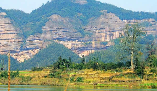 銅梁山位于湘潭縣石鼓鎮(zhèn)境內(nèi),山脈海拔700多米,地勢(shì)極為偏僻,正好處于湘潭縣與雙峰縣的交界之處。銅梁山名稱由來(lái)還有個(gè)美麗的傳說。在雙峰縣井字鎮(zhèn)與湘潭縣、湘鄉(xiāng)市交界處,有一座大山叫昌山。主峰靈應(yīng)峰海拔755.1米,是南岳72峰之一。在主峰與鷹尖石之間,橫臥著一條長(zhǎng)達(dá)2公里的一字形平脊嶺,當(dāng)?shù)厝私兴?ldquo;一字大脊”。相傳有一仙人挑著兩個(gè)大小不一的籮筐,掌燈時(shí)分就來(lái)到了大山腳下的花山村。熱情好客的花山人見了這位外來(lái)客人,格外歡喜,他們以美酒佳肴相陪,不知不覺已到雞鳴。仙人突然想起師父“雞鳴前一定要翻過大山”的教誨,趲告辭,挑起擔(dān)子飛也似的上山去?墒,送客的花山人一會(huì)兒便發(fā)現(xiàn),那人的擔(dān)子擱在了山頂,扁擔(dān)成了一條“一字脊”,兩個(gè)籮筐便成了一字脊兩端的“巒柱”,形似一個(gè)巨大的銅梁。因此,銅梁山這個(gè)美名便叫開了。