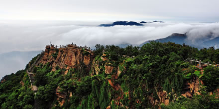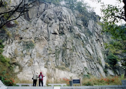 從遠(yuǎn)處山腰眺望一線天,這里就是著名的八戒石.很像一個戴著僧帽的老豬在綠樹叢中呼呼大睡。一線天下面是花果山山名摩崖石刻,游客都愛在這里留影,青山紅字,非常壯麗。這里還有天然碑、硯石等景觀。沿小路前進(jìn)可至墨香小徑,里面有百余位當(dāng)代書法名家的作品刻在天然石塊上;還可至怪石園,看千奇百怪與《西游記》有關(guān)的象形石。“神”字王在東部禿龍溝下,是刻在山體上的懷素草書“神”字,長39.4米、寬15.8米,為世界上最大的單體漢字,1996年被載入吉尼斯世界紀(jì)錄。 登上玉女峰是花果山之游的高潮,有緣的人在這里可看到云臺山兩個最為精彩的景致。一個是在迎曙亭看海上日出;另一個是看云臺鋪海,白云翻滾好像海水揚波,露出來的峰頂就像大海里的蓬萊仙島,群山俯伏,阡陌縱橫,此情此景令人有飄飄欲仙的感覺。