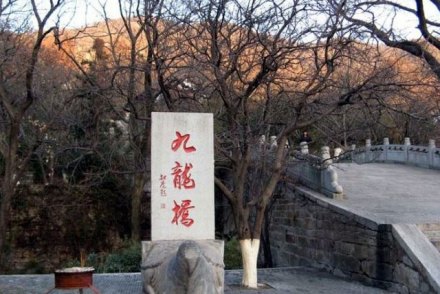 九龍橋是因為山上有九條山澗像九條舞動著的龍,從四面八方匯集于橋下而得名。那時候百姓都相信龍是神,一些香客就在此橋小憩一刻,來沾一點龍的壽氣,再進(jìn)山求佛,保全家萬事平安,因此九龍橋又叫萬壽橋。傳說花果山上原來有十條龍,九條龍在山里面住著,為了防止外族侵犯,便派了一條本事最大的禿龍到東面的山頭守衛(wèi)。山東莊還有禿龍山,那龍山上還有兩個對穿的山泉就是傳說中的龍耳。我們可以在橋上往南望,那遠(yuǎn)處的村莊便是山東莊。九龍橋畔有一棵千年老銀杏,粗大的枝椏已經(jīng)擠進(jìn)了橋身,橋上橋下布滿樹蔭,給游客提供了休息納涼的理想場所。