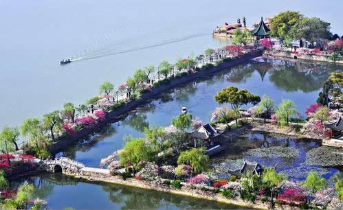 南堤春曉 四季亭南,沿湖筑大堤半圍,陽春三月,堤上300余株垂柳,柳枝飄曳,400余株桃花競(jìng)相吐艷。一湖碧水,數(shù)峰青山,分外妖嬈。長(zhǎng)堤西南角臨湖屹立六角亭,綠瓦紅柱,亭內(nèi)12根楞木上雕有60只金鳳凰,每5只鳳凰由一條龍率領(lǐng)。正中繪以雙龍戲珠,故俗呼“龍風(fēng)亭”。亭上懸“月波平眺”額,亭旁有游船碼頭,通黿頭渚風(fēng)景區(qū)。