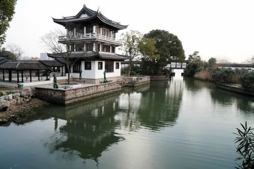春秋閣西,池中有堤,上有拱橋,名“映月”。西北有亭,六柱圓頂,上嵌紫陶碎片,閃閃有光。北有小河,上架拱橋,橋上建卷棚式屋三楹,名水淼亭,中有漏窗觀景。
