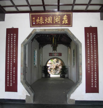 這是一幢頗具江南地方特色的“石庫門”建筑,原系“漁莊”大門,經(jīng)數(shù)次改筑,辟為蠡園正門。它面闊三間,進(jìn)深九界,雙坡小青瓦屋頂,方磚貼面,下為金山石墻裙,門額為金色“蠡園”二字。門廳后墻又開八角形門洞,接出暗廊,廊端又開月洞,由此入園。