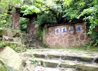 黿頭渚牌樓建于1973年,是前黿頭渚風(fēng)景區(qū)的老大門,是無錫十八景之首“黿渚春濤”的序幕!包x”是形似海龜?shù)囊环N動物,“渚”是指三面臨水的小陸地,因為它狀如黿頭而叫黿頭渚。門樓背后刻有“山輝川媚”4個大字,點(diǎn)出了這里“山不高而秀雅,水不深而遼闊”風(fēng)景的特色。大道前面,有300米的杜鵑坡,杜鵑花是無錫市的市花,清明時節(jié)樹叢、林下、溪邊的杜鵑花開遍山野,映的滿山都是紅色。兩邊是香樟樹,它是無錫的市樹。
