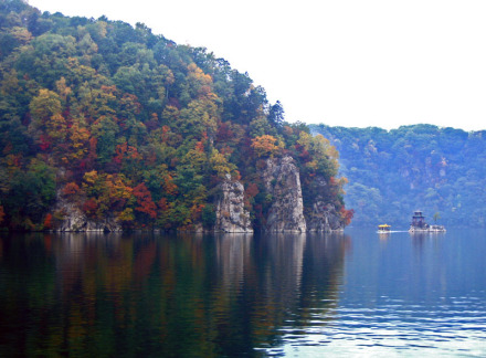 映霞壁是碼頭邊的陡峭石壁,高90余米,面向正東,每天朝陽初升的時候,萬丈霞光與水氣發(fā)生了光學(xué)折射,遠遠望過來,佛光普照,宛如迷離仙境一般。