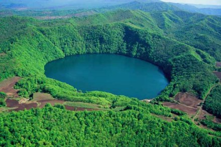 湖的周圍青山環(huán)抱,象一條巨龍盤臥在湖邊,又稱火山湖為龍灣。 7個火山湖沿龍崗山脈西側(cè),呈東北——西南方向有序排列,每湖間隔約為6——7公里,象一串6顆璀璨明珠鑲嵌在層巒疊嶂的白山峻嶺之中。在這串明珠中三角龍灣是最雄秀的。這里海拔 833 米,雖然灣面大約只有 42.6 公頃,但在三角龍灣的中心地帶,它的最深點達到 96 米。