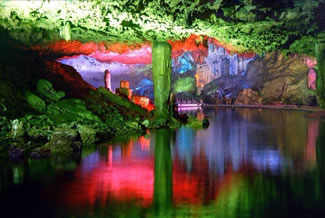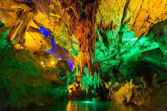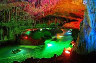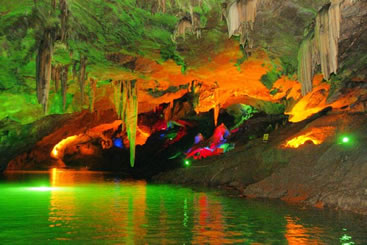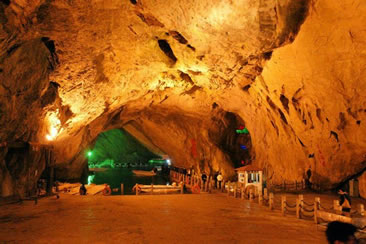 通往水洞的碼頭,千余平方米的水面,宛如一幽靜別致的“港灣”,燈光所及,水中游船、洞中石景倒映其中,使人如入仙境。從護(hù)岸石階拾級(jí)而下,通過(guò)長(zhǎng)廊從碼頭上船,即可暢游水洞。水洞全長(zhǎng)5800米,現(xiàn)已開(kāi)發(fā)2800米,面積3.6萬(wàn)平方米,空間40余萬(wàn)立方米,最開(kāi)闊處高38米,寬70米。