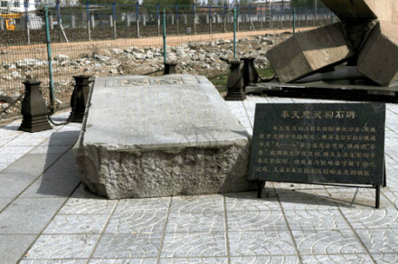 奉天忠靈祠石碑:日本帝國主義先后在沈陽建立了“日俄奉天大會戰(zhàn)紀(jì)念碑”和“靖國神社奉天分社忠靈祠、忠靈塔、忠靈碑”,用來埋葬侵華日軍在日俄戰(zhàn)爭至“九·一八”事變期間戰(zhàn)死者的36400多個(gè)將士的遺骨。