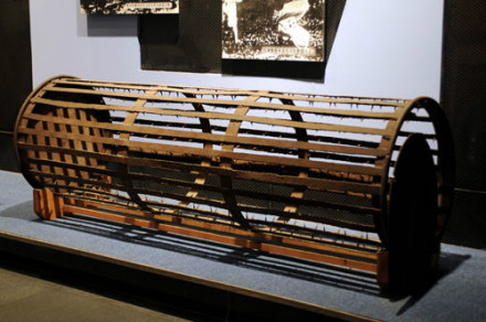 滾地籠刑具:這件黑色的鐵制滾地籠刑具,就是日偽時(shí)期被用于迫害抗日反滿志士及廣大無辜群眾的刑具。它縱66厘米,橫200厘米,呈圓柱形,中空,籠內(nèi)壁鑲滿鋒利的釘刺,釘尖向內(nèi),側(cè)面為鐵皮蓋,可打開。 該刑具原存于沈陽階級教育展覽館,后由遼寧近現(xiàn)代歷史博物館收藏,1998年,調(diào)撥給“九·一八”事變紀(jì)念館擴(kuò)建辦,1999年9月18日轉(zhuǎn)入“九·一八”歷史博物館收藏。