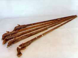 拐杖刀:俗稱“二人奪”,長約90厘米。表面上看呈拐杖型,木質(zhì)。但實(shí)際上,其前面是可以斷開的,拔出外鞘,里面是一個(gè)刺刀。這是抗日斗爭初期,東滿游擊隊(duì)和當(dāng)?shù)厝罕娪脕韺Ω稊橙说拿孛芪淦鳌J钱?dāng)時(shí)很流行很實(shí)用的武器。