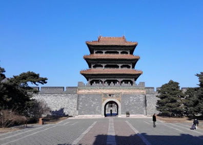 第三部分:方城、寶城、月牙城。與碑亭相對的就是隆恩門,過了隆恩門就是方城了,它是昭陵的主體建筑,隆恩殿居于其中,后面是明樓,左右有配殿,四邊有角樓。過了明樓,是寶城,它下面就是葬有皇太極夫婦的地宮。