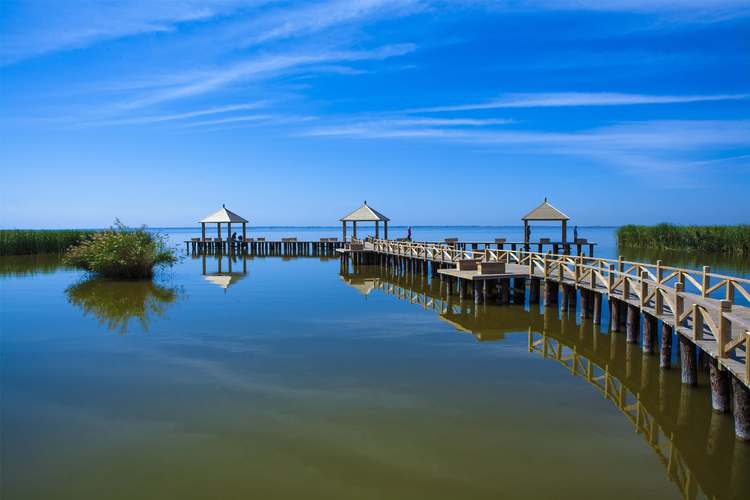 哈素海水質(zhì)肥沃,湖內(nèi)蘆葦叢生、鳥飛魚躍。岸邊涼亭水榭柳綠成蔭,碧水青山相映成輝,有"塞外西湖"之稱。置身哈素海,極目遠眺,只見晴空碧水,蔚藍一色,蒲萍叢叢,你會覺得哈素海宛如已一副淡雅的水墨畫。如果你停舟湖中,看對對歐鳥翻飛底空,群群野鴨出沒葦叢,聽遠處高亢聊亮的漁歌,近旁魚躍出水波剌剌的 聲響,你會感覺到哈素海像一首詩。