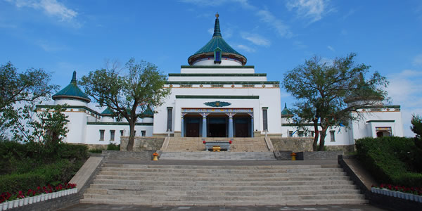 成吉思汗廟坐落在興安盟烏蘭浩特市罕山之巔,始建成于1940年,這座融漢、蒙、藏三個民族建筑風(fēng)格于一體的廟宇,從正面看是"山"字形。正殿當中有16根粗大的紅漆明柱,四周繪有反映成吉思汗業(yè)績的精美圖案,中央為2.8米高的成吉思汗銅像;兩偏殿陳列有元代的兵器,服裝,瓷器等復(fù)制品,山門到正殿有寬10米、長158米用花崗巖砌成的81級臺階。成吉思汗廟融蒙、漢 、藏三個民族的建筑風(fēng)格于一體, 采取古代漢族建筑中慣用的中軸對稱布局手法,建筑主體圓頂方身,綠帽白墻,具有典型的蒙、藏建筑特色。