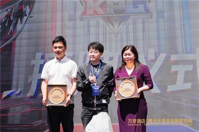 騰訊互娛天美L1工作室王者榮耀全國(guó)大賽負(fù)責(zé)人唐然上臺(tái),授予了萬(wàn)斐酒店騰訊天美電競(jìng)數(shù)娛空間第九屆王者榮耀全國(guó)大賽——浙江省賽官方指定舉辦方,以及杭州賽區(qū)唯一指定總賽點(diǎn)的榮譽(yù)。由西湖文旅旅游發(fā)展有限公司副總經(jīng)理任亮,和上海歐愉科技總經(jīng)理史央清上臺(tái)接受授牌。