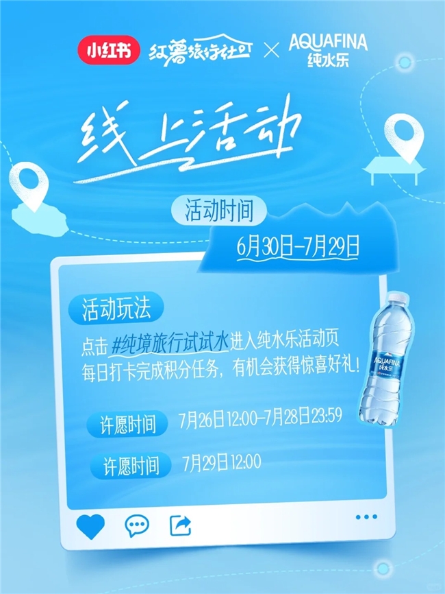貼合旅行魅力,一場線上線下聯(lián)動的全新旅行玩法就此展開。@AQUAFINA純水樂 官方賬號在小紅書發(fā)布游玩號召視頻官宣活動,分享這場“水是純凈的,心是自由的”旅行概念。小紅書@好好玩情報局 承接活動外放,介紹線上線下活動玩法,正式開啟為期一個月的攢積分任務(wù)限時許愿贏好禮活動,以趣味性互動玩法、豐厚的獎勵機(jī)制吸引用戶主動關(guān)鍵詞搜索、品牌筆記瀏覽、品牌主頁關(guān)注、分享品牌信息,助力純水樂品牌成功將流量變?yōu)榱?ldquo;留量”。