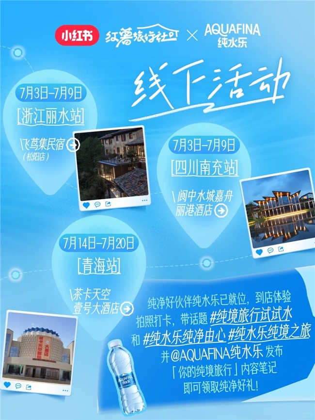 在三位“先鋒試水官”的帶動下,四川南充、浙江麗水、青海三大純境路線被更多用戶關(guān)注。純水樂也協(xié)同小紅書在三大純境路線合作的民宿酒店設(shè)置線上線下聯(lián)動新玩法。7月3日-7月9日,浙江麗水站飛蔦集民宿(松陽店)、四川南充站閬中水城嘉舟麗港酒店線下互動贏好禮活動率先啟動,位于青海的茶卡天空壹號大酒店7月14日-7月20日也很快解鎖加入該活動。