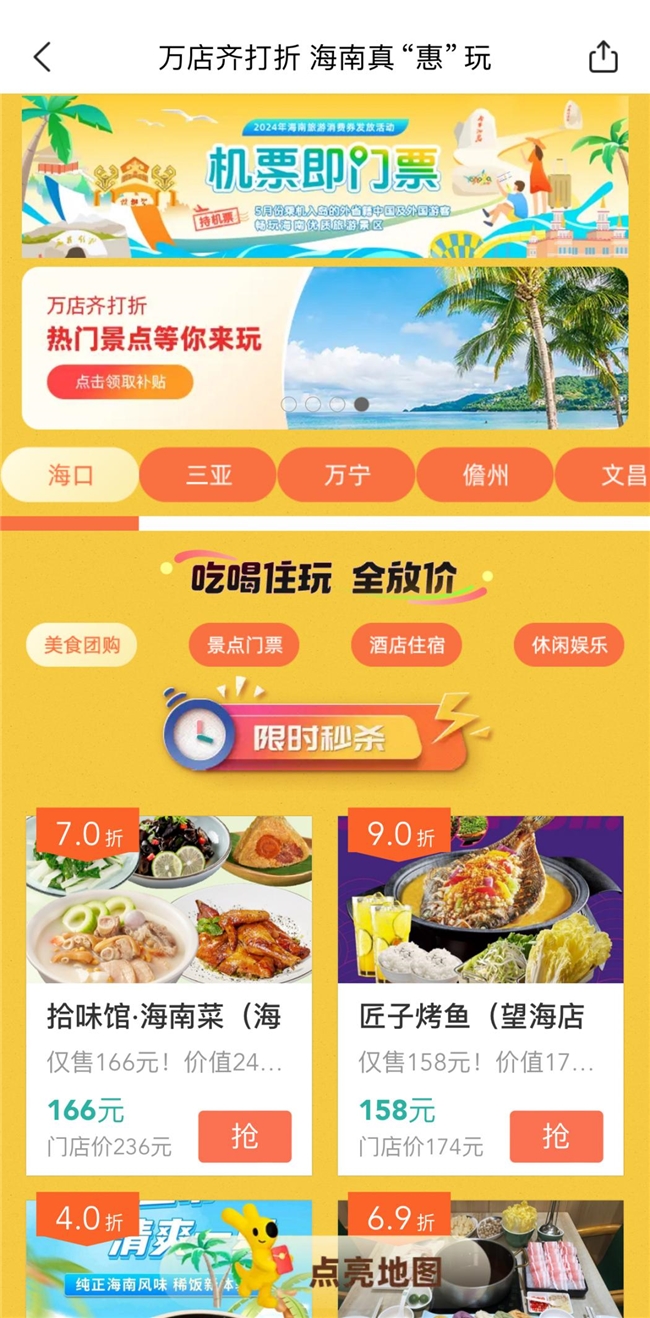 “萬店齊打折 海南真惠玩”主題營銷活動由海南省旅游和文化廣電體育廳和美團(tuán)聯(lián)合發(fā)起,活動覆蓋了海南省內(nèi)十八個城市,全品類商家紛紛參與,為游客們帶來了前所未有的優(yōu)惠和福利;顒悠陂g海南省旅文廳聯(lián)合美團(tuán)攜手一萬家商戶,為廣大消費者和游客提供了不低于1000萬遠(yuǎn)的補(bǔ)貼折扣,用戶只要在美團(tuán)App、大眾點評App搜索“萬店齊打折”等字樣,即可進(jìn)入專題頁,參與各類福利活動。