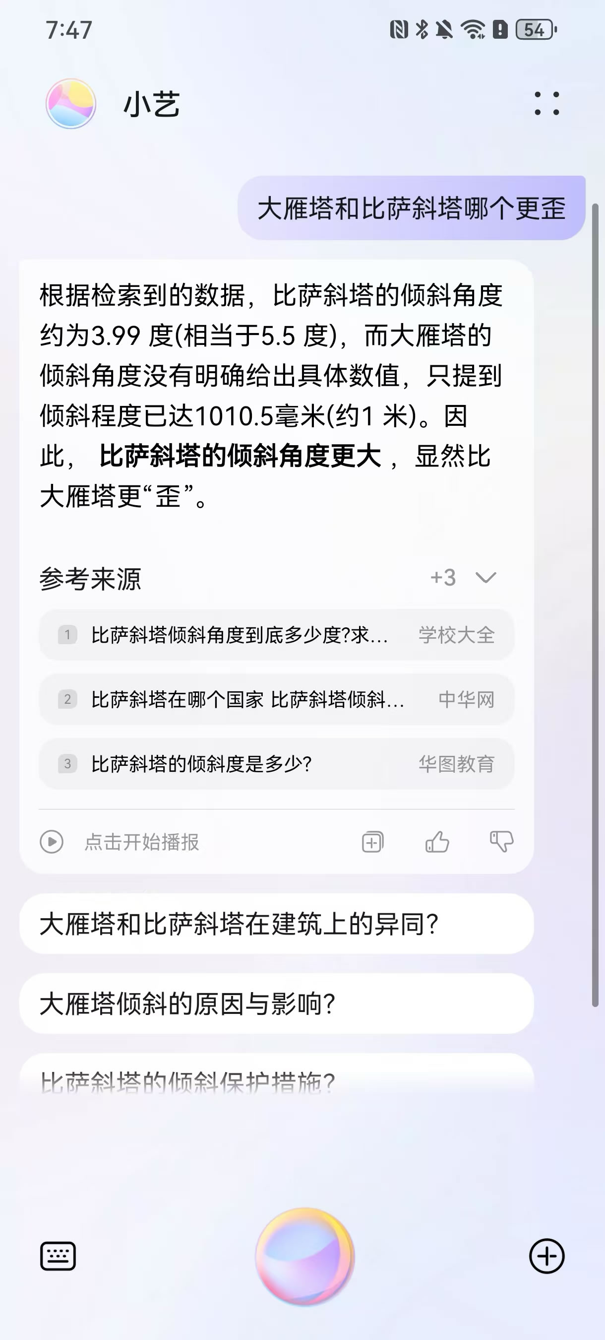 確定好目的地之后,到底怎么玩?對大多數(shù)人來說,既要規(guī)劃詳細(xì)、又要細(xì)節(jié)不出紕漏的“完美旅行攻略”非常費(fèi)時費(fèi)力。而小藝可以從特色景點、住宿、餐飲、注意事項等多個維度出發(fā),結(jié)合用戶確定的旅行目的地,為你解答各種旅行知識,堪稱旅行界的百科全書。用戶只需長按華為手機(jī)電源鍵或者對手機(jī)說“小藝小藝”即可喚醒小藝,不論是詢問當(dāng)?shù)氐娜宋闹R、歷史典故,還是推薦熱門景點、美食小吃,小藝都能對答如流,幫助大家更快速了解目的地的相關(guān)信息。比如你可以直接問它“為什么景德鎮(zhèn)的瓷器很出名”、大雁塔和比薩斜塔哪個更歪” “為什么很多人喝不慣北京豆汁兒”,通過各種問題逐漸了解到目的地的各種信息,幫助提升旅行體驗。