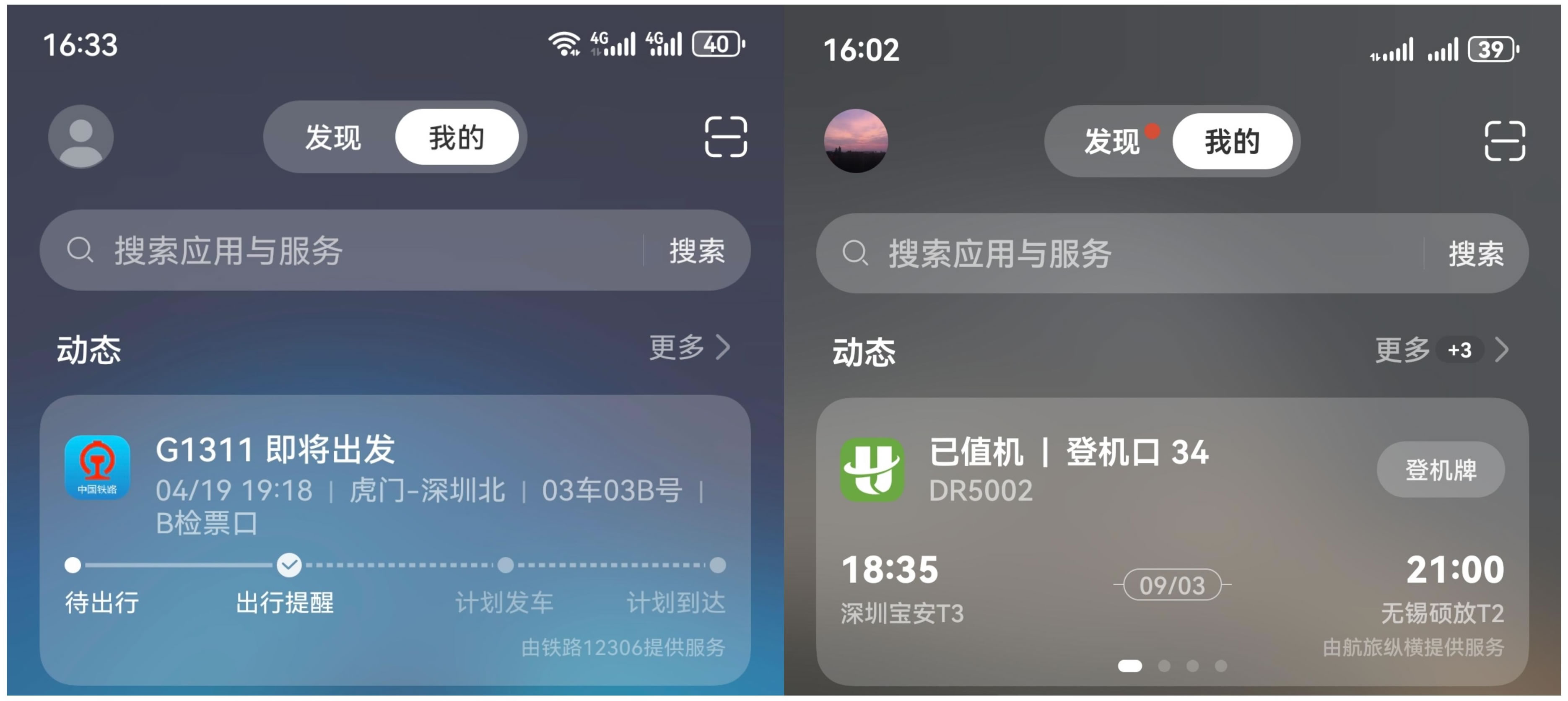 假期出行高峰期,高鐵飛機(jī)可能會晚點、延誤,出行信息繁多且易忘。華為負(fù)一屏提供的實時動態(tài)卡片就非常實用。在負(fù)一屏打開航班、火車服務(wù)通知,綁定賬號后,只需手機(jī)桌面右滑至負(fù)一屏,即可查看12306火車或航旅縱橫航班實時動態(tài),輔助旅途中行程安排準(zhǔn)確及時、防止遺忘重要信息。