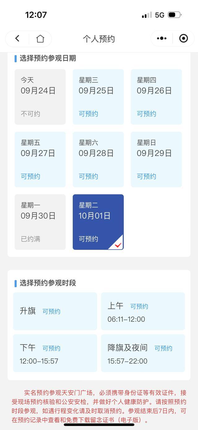 9月24日中午12時(shí),10月1日“升旗”時(shí)段的預(yù)約對(duì)外開放。不到半小時(shí),國慶節(jié)當(dāng)天“升旗”已經(jīng)全部約滿。