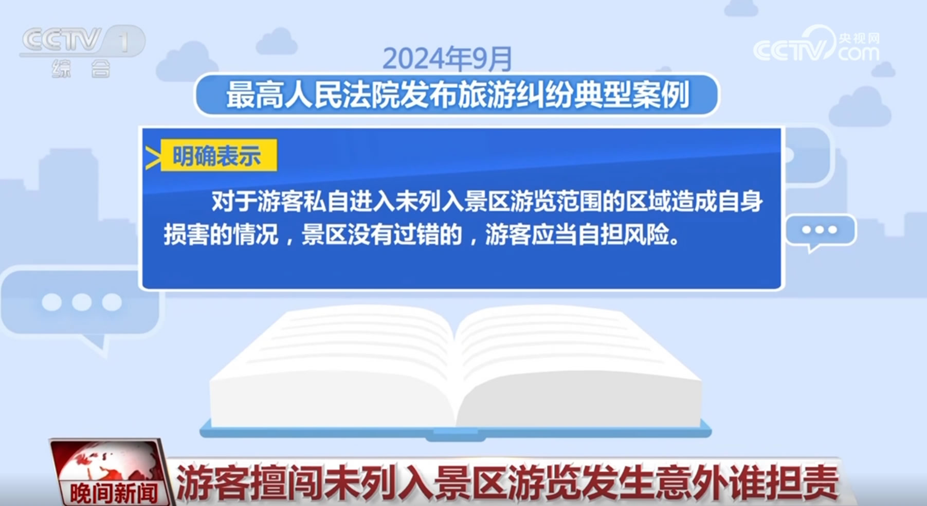 今年9月,最高人民法院發(fā)布旅游糾紛典型案例,明確表示:對于游客私自進(jìn)入未列入景區(qū)游覽范圍的區(qū)域造成自身損害的情況,景區(qū)沒有過錯(cuò)的,游客應(yīng)當(dāng)自擔(dān)風(fēng)險(xiǎn)。