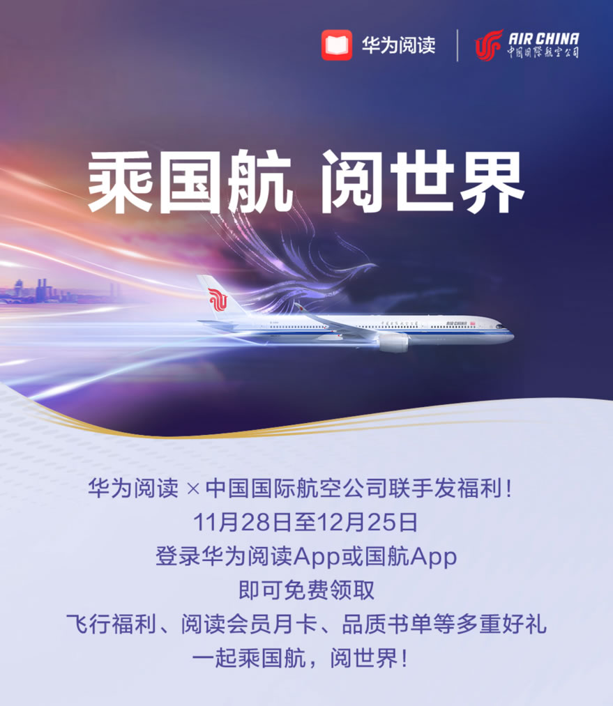 為了豐富旅客的飛行時(shí)光,近日華為閱讀與中國(guó)國(guó)際航空公司攜手,正式啟動(dòng)了“乘國(guó)航 閱世界”國(guó)航伴讀計(jì)劃,該計(jì)劃通過(guò)整合華為閱讀的豐富資源與國(guó)航的全球航線網(wǎng)絡(luò),為用戶打造一個(gè)旅行中的高品質(zhì)閱讀空間。參與此次活動(dòng)的用戶將可免費(fèi)領(lǐng)取3重好禮!包含了國(guó)航用戶多重福利、30天華為閱讀會(huì)員、精選國(guó)航伴讀書(shū)單,帶旅客悅享旅途的美好。