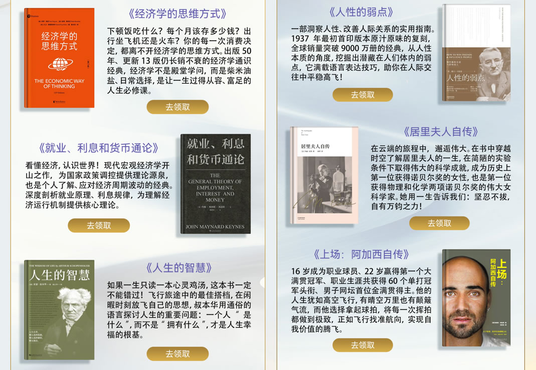 華為閱讀與國(guó)航共同精選了適合旅途閱讀的“國(guó)航伴讀書(shū)單”,包括《經(jīng)濟(jì)學(xué)的思維方式》、《就業(yè)、利息和貨幣通論》、《人生的智慧》、《人性的弱點(diǎn)》、《居里夫人自傳》、《上場(chǎng):阿加西自傳》等好評(píng)付費(fèi)書(shū)籍,并提供給國(guó)航用戶免費(fèi)閱讀,為乘客的飛行時(shí)光帶來(lái)更多精神享受。