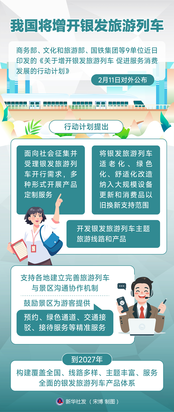 商務(wù)部、文化和旅游部、國鐵集團(tuán)等9單位近日印發(fā)的《關(guān)于增開銀發(fā)旅游列車 促進(jìn)服務(wù)消費(fèi)發(fā)展的行動(dòng)計(jì)劃》11日對外公布,從增加銀發(fā)旅游列車服務(wù)供給、強(qiáng)化適老化設(shè)施保障、提升銀發(fā)旅游列車服務(wù)水平、優(yōu)化銀發(fā)旅游列車發(fā)展環(huán)境等方面提出12條具體舉措。