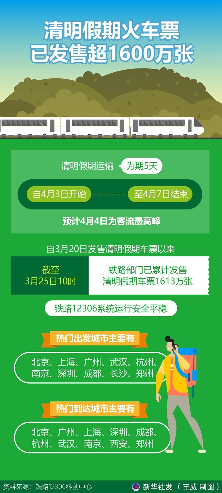 記者25日從鐵路12306科創(chuàng)中心獲悉,清明假期運(yùn)輸自4月3日開(kāi)始,至4月7日結(jié)束,為期5天,預(yù)計(jì)4月4日為客流最高峰。自3月20日發(fā)售清明假期車票以來(lái),截至3月25日10時(shí),鐵路部門已累計(jì)發(fā)售清明假期車票1613萬(wàn)張,鐵路12306系統(tǒng)運(yùn)行安全平穩(wěn)。