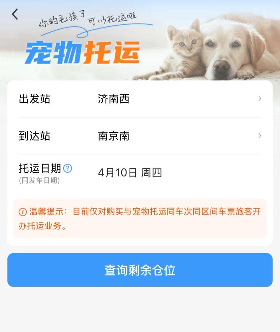 記者查詢鐵路12306App發(fā)現(xiàn),在“全部應(yīng)用”頁面“精選應(yīng)用”板塊,“寵物托運”功能已經(jīng)上線。點擊“預(yù)約下單”,填寫選擇出發(fā)站、到達站以及托運日期后,再點擊“查詢剩余倉位”,托運旅客即可查詢剩余寵物倉位,并從車票訂單或本人車票中選擇已購買的車票信息進行關(guān)聯(lián)。