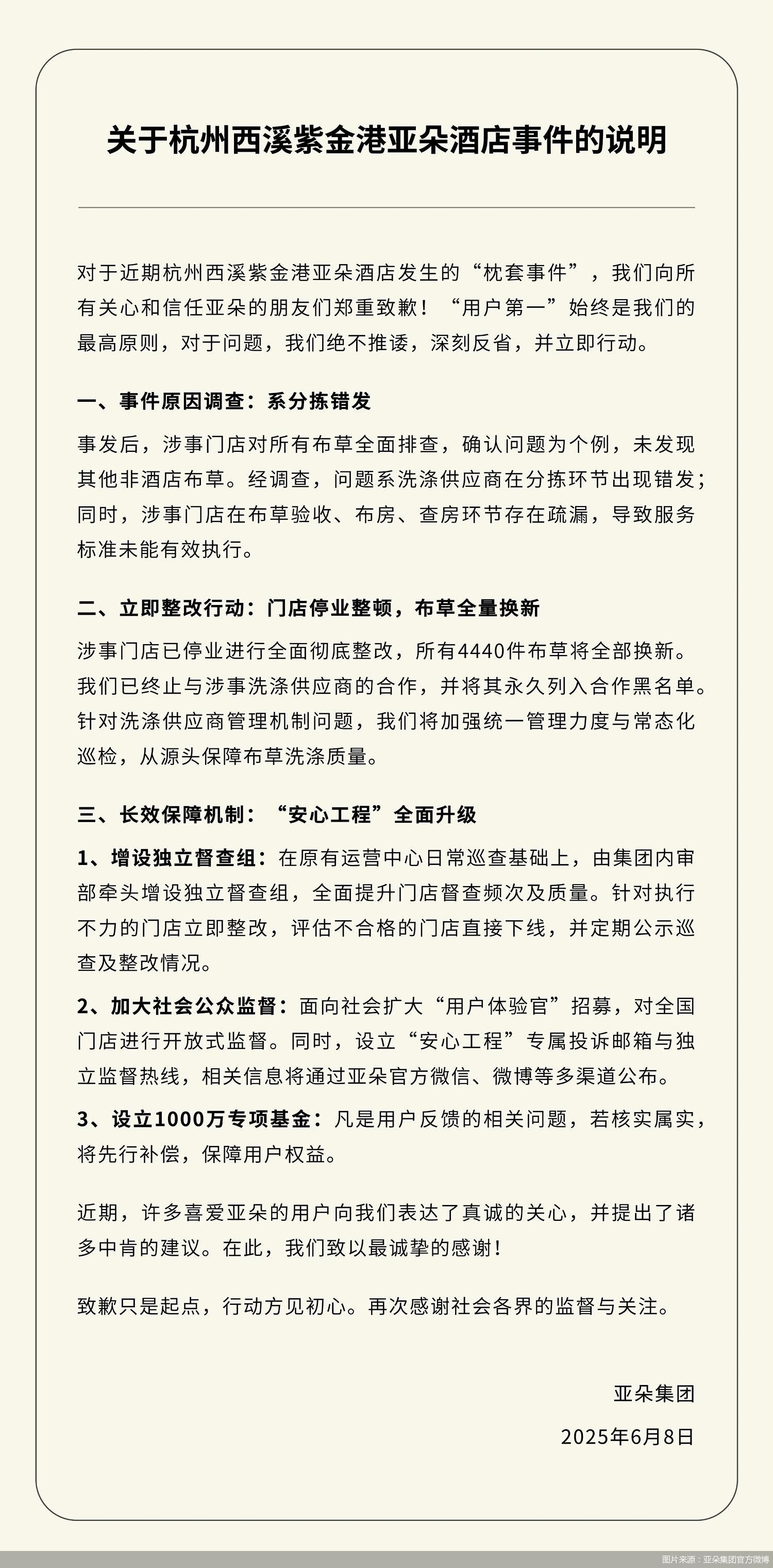 6月8日,據(jù)“亞朵集團(tuán)”官方微博消息,亞朵集團(tuán)發(fā)布關(guān)于杭州西溪紫金港亞朵酒店事件的說明,對于近期杭州西溪紫金港亞朵酒店發(fā)生的“枕套事件”,亞朵集團(tuán)向所有關(guān)心和信任亞朵的朋友們鄭重致歉。事發(fā)后,涉事門店對所有布草全面排查,確認(rèn)問題為個(gè)例,未發(fā)現(xiàn)其他非酒店布草。經(jīng)調(diào)查,問題系洗滌供應(yīng)商在分揀環(huán)節(jié)出現(xiàn)錯(cuò)發(fā);同時(shí),涉事門店在布草驗(yàn)收、布房、查房環(huán)節(jié)存在疏漏,導(dǎo)致服務(wù)標(biāo)準(zhǔn)未能有效執(zhí)行。