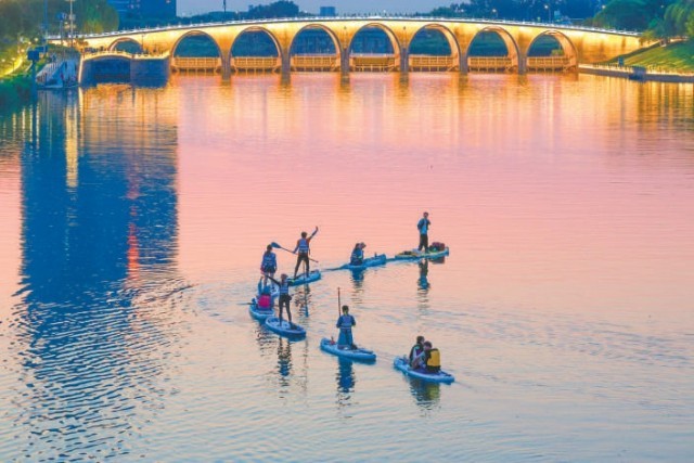 水聲、指導聲,夾雜著成功駕馭后的歡呼聲,交織成大運河上獨特的活力樂章。微風拂過,帶來水汽的清涼,也吹散了一些夏日燥熱。阿珂說,俱樂部正在推廣“城市微度假、微旅行”的理念,給年輕人打造一個不用出遠門就有休閑度假感的娛樂解壓場景。“大運河比城里的護城河、亮馬河寬闊得多,傍晚時分波光粼粼的感覺棒極了!濱水休閑步道以及各類配套服務設施也挺完善,真的很適合微度假。”他說,接下來希望能帶更多人在大運河上體驗槳板運動的快樂。