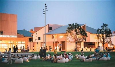 游客在秦皇島阿那亞社區(qū)內的街區(qū)廣場上休閑。