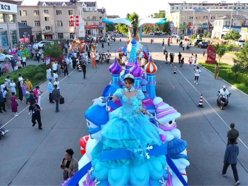 “冰雪綺夢(mèng)花車”,巧妙融合了伊春作為“紅松故鄉(xiāng)”的生態(tài)特色與對(duì)俄開放的地緣優(yōu)勢(shì)。銀裝素裹的紅松林展現(xiàn)北國(guó)冰雪魅力,俄羅斯城堡造型呼應(yīng)伊春作為中俄邊境城市的開放姿態(tài)。雪人點(diǎn)綴其間營(yíng)造歡樂氛圍,底部藍(lán)色水系裝飾象征黑龍江流域的聯(lián)通作用。花車通過冰雪童話場(chǎng)景,既展示了伊春冬季旅游的獨(dú)特吸引力,更傳遞出“以冰雪為媒,促開放合作”的發(fā)展理念,生動(dòng)詮釋了伊春立足生態(tài)優(yōu)勢(shì)、深化對(duì)外合作、推動(dòng)高質(zhì)量發(fā)展的戰(zhàn)略方向,誠(chéng)邀八方賓客共赴冰雪之約、共享開放機(jī)遇。