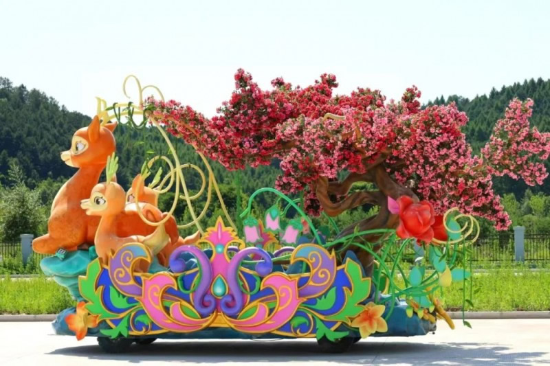 “鹿逐花夢(mèng)花車”,巧妙融合了小興安嶺獨(dú)特的自然景觀與生物多樣性。車頭三只靈動(dòng)的小鹿象征著伊春“中國(guó)鹿鄉(xiāng)”的美譽(yù),與九峰山、金山鹿苑等標(biāo)志性景觀交相輝映。盛開的杜鵑、百合和冰凌花點(diǎn)綴其間,展現(xiàn)伊春四季分明的生態(tài)特色;ㄜ囃ㄟ^森林古樹與野生動(dòng)物的和諧共生場(chǎng)景,生動(dòng)詮釋了伊春“生態(tài)立市”的發(fā)展理念,既彰顯了“中國(guó)林都”豐富的自然資源,又傳遞出人與自然和諧共處的生態(tài)文明思想,讓觀眾在夢(mèng)幻的森林之旅中感受生態(tài)保護(hù)的深遠(yuǎn)意義。
