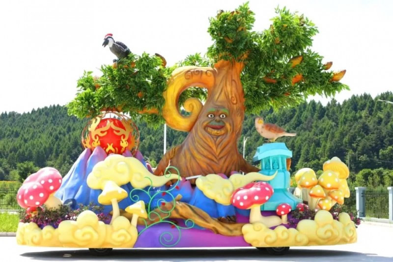 “林間秘境”花車,巧妙融合了小興安嶺原始森林的獨(dú)特魅力。潔白的白樺林與蒼翠的紅松林交相輝映,展現(xiàn)伊春作為“紅松故鄉(xiāng)”的生態(tài)底蘊(yùn)。靈動(dòng)的松鼠、威武的東北虎、呆萌的狍子和憨厚的黑熊,共同演繹著森林王國(guó)的和諧樂章;ㄜ囃ㄟ^生動(dòng)的動(dòng)植物造型,不僅呈現(xiàn)了伊春豐富的生物多樣性,更傳遞出“綠水青山就是金山銀山”的生態(tài)理念,彰顯這座森林之城在生態(tài)文明建設(shè)中的示范意義,喚起人們對(duì)自然保護(hù)的深切關(guān)注。
