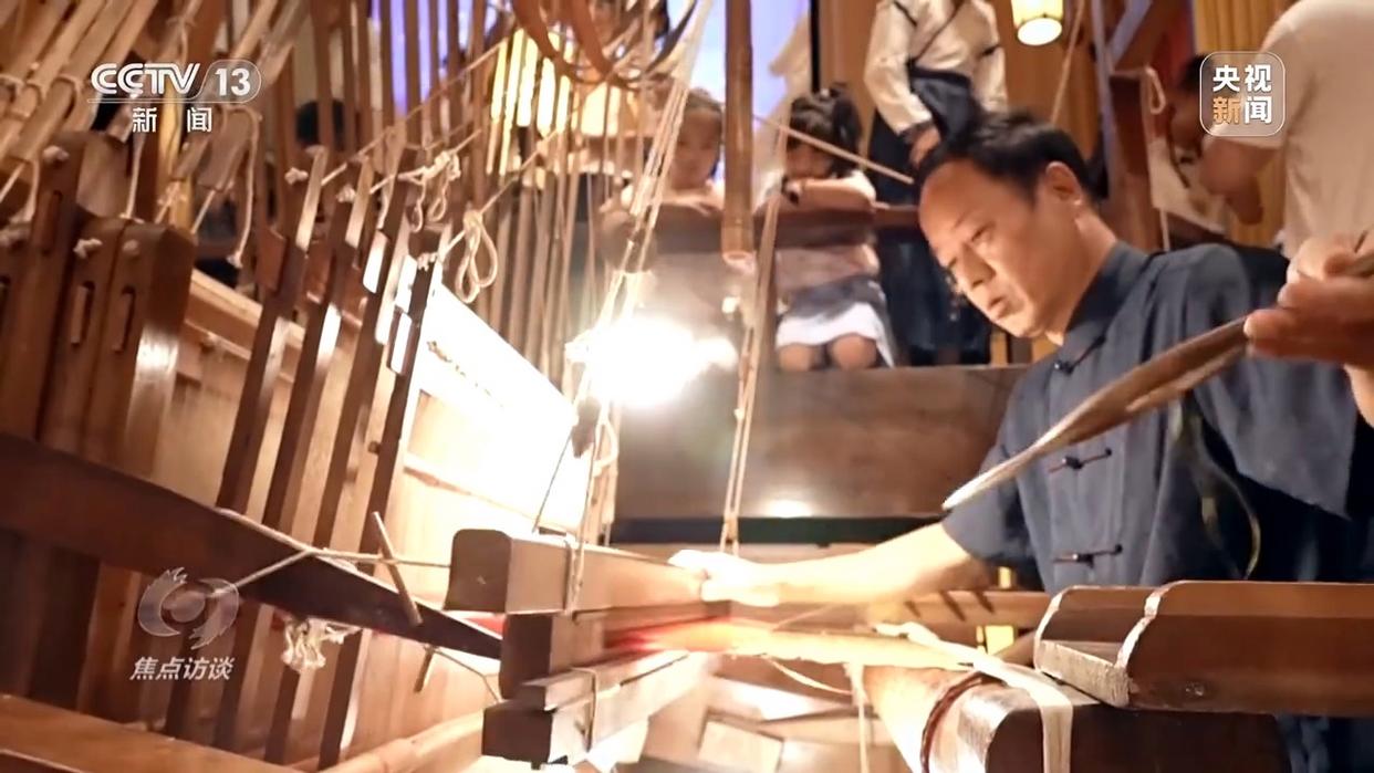 整個(gè)博物館最為壯觀的莫過于核心位置的大型蜀錦織造工場,蜀錦非遺省級傳承人曹代武正帶領(lǐng)團(tuán)隊(duì),在一臺清代道光年間的小花樓木織機(jī)前,為游客們演繹著古老的織造技藝。這臺織機(jī)長6米、高5米、寬1.5米,龐大的木質(zhì)“機(jī)甲”與機(jī)器上細(xì)如發(fā)絲的絲線形成強(qiáng)烈反差。兩位織機(jī)師傅默契配合、共同操作,方能織就那一幅幅絢麗奪目的蜀錦。