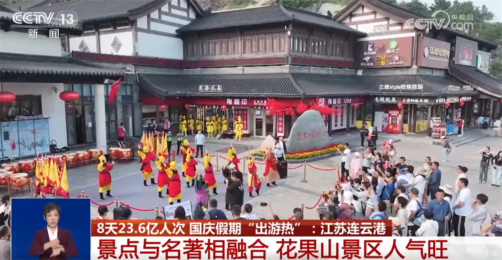 沿著蜿蜒山路,游客們拾級而上,走進“水簾洞”登上“玉女峰”,感受藍天如洗、白云舒展的豪邁。不少游客還在山頂揮舞國旗,慶祝共和國生日。花果山景區(qū)將景點與名著深度融合,為游客準備了取材自《西游記》精彩片段的情景演出,分布在游客上山的途中,精彩節(jié)目輪番登場,為游客營造出熱鬧喜慶氛圍。