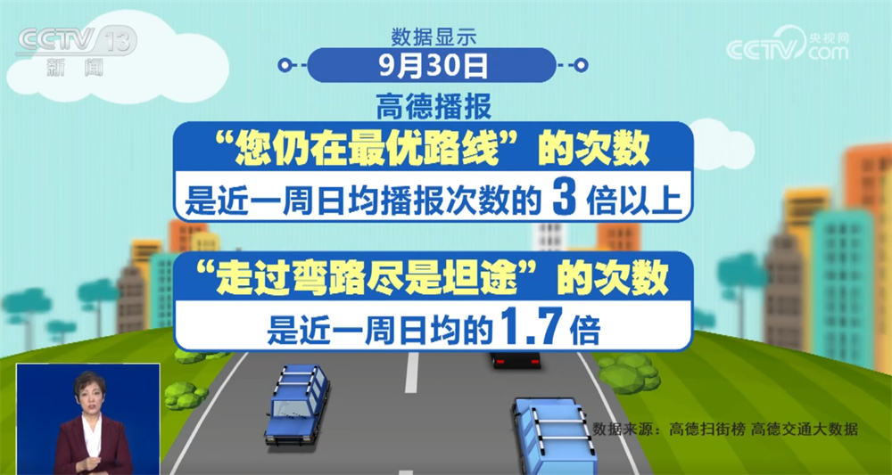 我們再來看一個有趣的數(shù)據(jù)。“雖然前方擁堵,但您仍在最優(yōu)路線上”“今天走過了所有彎路,從此人生盡是坦途”,高德導航的“勸堵”金句與長假出行實時相伴。數(shù)據(jù)顯示,9月30日,高德播報“您仍在最優(yōu)路線”的次數(shù)是近一周日均播報次數(shù)的3倍以上,播報“走過彎路盡是坦途”的次數(shù)是近一周日均的1.7倍,可見自駕出行的人越來越多。不過,也有重慶網(wǎng)友表示“扎心”,“走過彎路還是彎路,坦途這句等我開出重慶再說。”