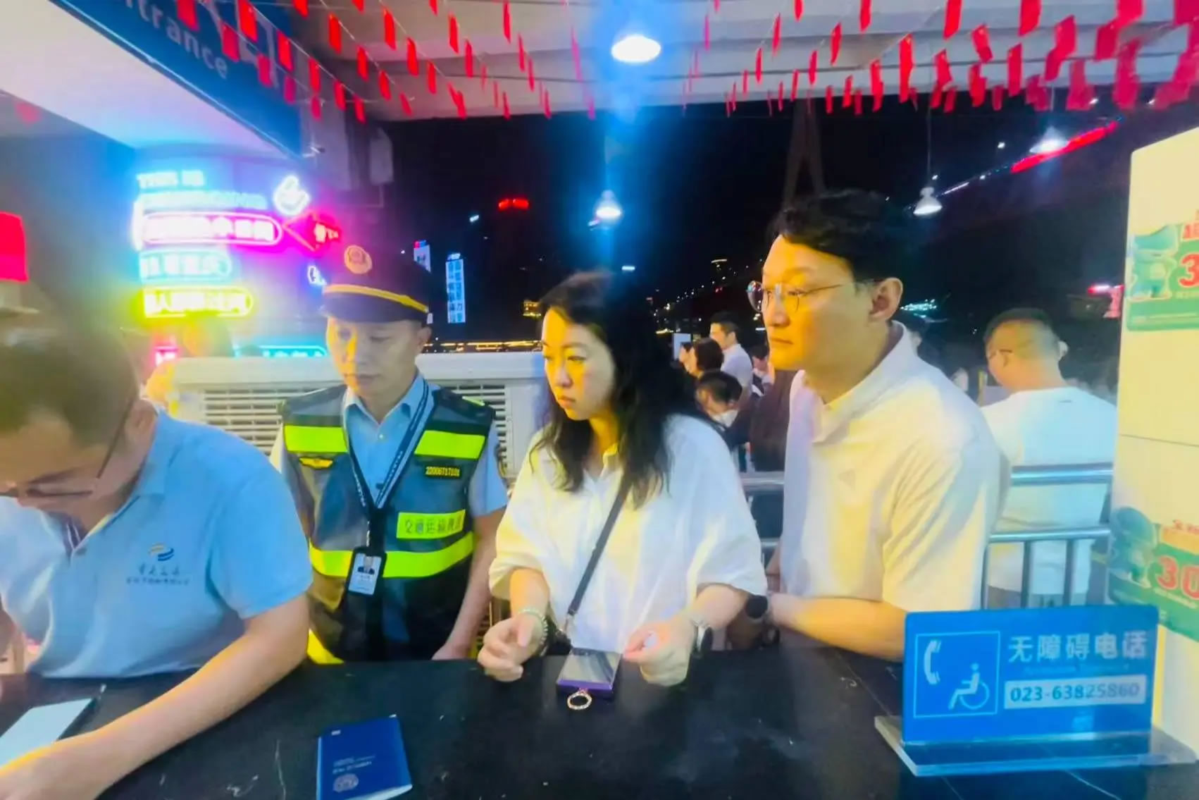 10月5日晚,兩名韓國游客因手機(jī)損壞無法出示購票信息,向洪崖洞客運(yùn)碼頭兩江游執(zhí)法服務(wù)站求助。執(zhí)法人員一邊安撫游客,一邊協(xié)調(diào)技術(shù)人員通過后臺(tái)系統(tǒng)查詢,不到5分鐘便幫助游客順利登船。這一高效處置展現(xiàn)了服務(wù)站“事企聯(lián)動(dòng)”機(jī)制的優(yōu)勢,也為外國游客留下了美好的重慶印象。