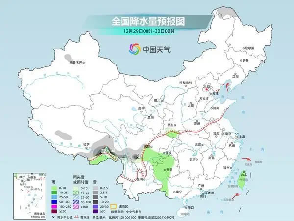 預(yù)計30日夜間開始,隨著暖濕氣流增強,西藏東部、四川、貴州、重慶、陜西南部、湖北西部等地降水又會發(fā)展增多。之后,水汽繼續(xù)向東、向北輸送,黃河以南地區(qū)將出現(xiàn)一輪“跨年”降水。目前來看這輪降水范圍廣,但強度不大,多是小到中雨雪量級。公眾需密切關(guān)注臨近預(yù)報,做好相關(guān)防范措施。