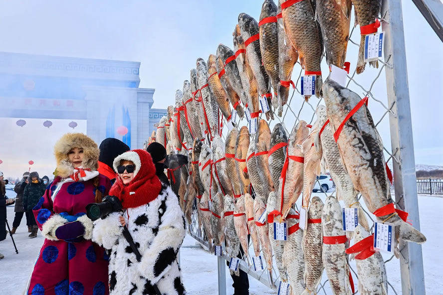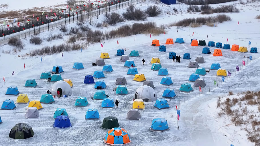 活動(dòng)融合冰釣體驗(yàn)、民俗展演與文化展示等,為游客打造了一場(chǎng)集運(yùn)動(dòng)、美食、互動(dòng)于一體的沉浸式冰雪文旅盛宴。作為核心項(xiàng)目,中俄界河冰釣與冰捕區(qū)備受矚目。界河之上,五顏六色的暖帳錯(cuò)落排布,冰釣愛(ài)好者早已按捺不住垂釣熱情,在帳篷內(nèi)生起暖爐、鑿開(kāi)冰面、下好魚(yú)餌,支起小板凳,靜觀浮漂等候“佳音”。
