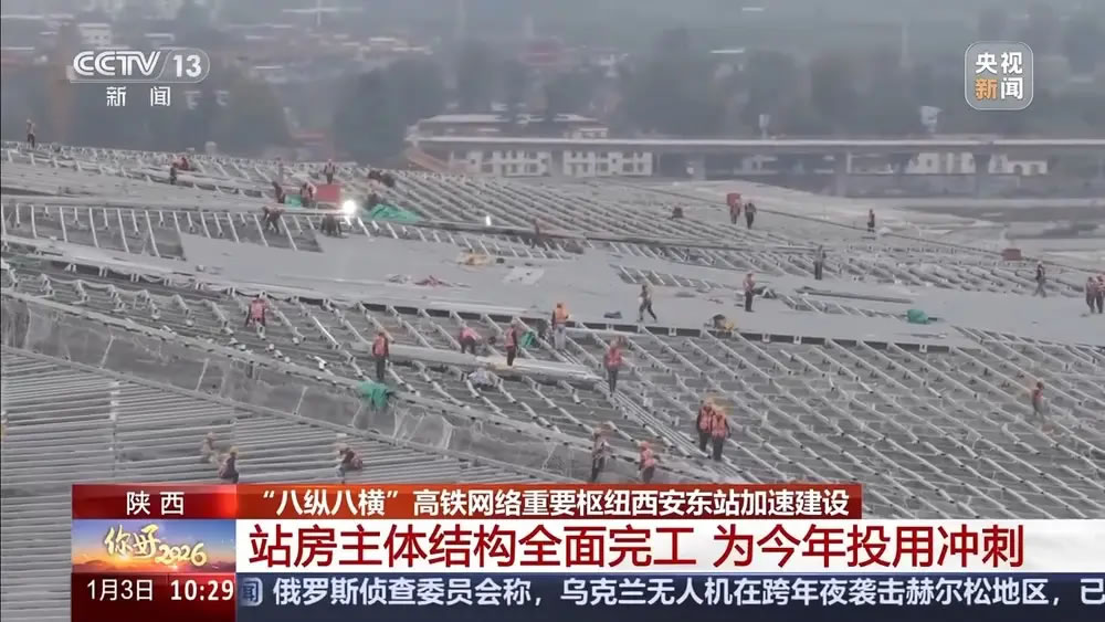 總臺記者 甘軻晗:在西安市灞橋區(qū)的西安東站建設(shè)現(xiàn)場,目前工程已轉(zhuǎn)入金屬屋面玻璃天窗安裝、幕墻立面龍骨安裝和內(nèi)部裝飾裝修階段。盡管還處于元旦假期,站房建設(shè)依然在全速推進。工作人員告訴我,今天現(xiàn)場仍有2000多名建設(shè)者堅守施工一線,為今年西安東站的正式投用發(fā)起沖刺。