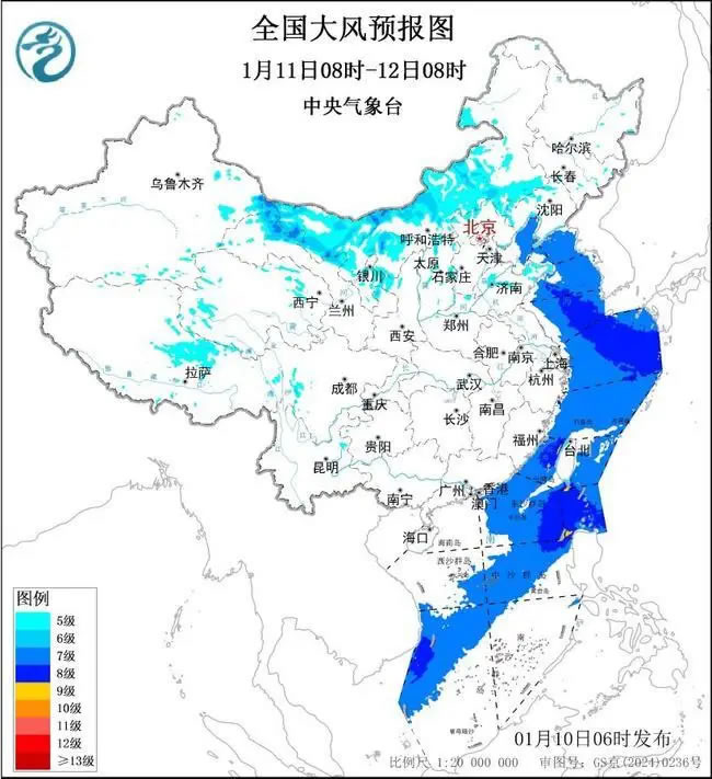1月11日08時至12日08時,西藏中部、甘肅北部、內(nèi)蒙古中西部、寧夏北部、陜西西部、山西北部、河北北部、山東半島、遼東半島等地部分地區(qū)有5~7級大風(fēng)、陣風(fēng)8~9級;渤海、渤海海峽、黃海大部海域、東海大部海域、臺灣海峽、臺灣以東洋面、巴士海峽、南海東北部和中部海域、南海西南部海域?qū)⒂?~8級、陣風(fēng)9~10級的大風(fēng),其中臺灣海峽、巴士海峽、南海東北部的部分海域風(fēng)力可達9級、陣風(fēng)10~11級。