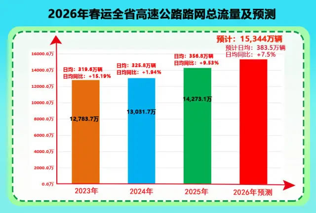 2026年春運將于2月2日開始,3月13日結(jié)束,共計40天。春節(jié)假期小型客車免費通行時間為2月15日至2月23日。省高速公路路網(wǎng)運行監(jiān)測指揮中心研判,春運40天全省高速公路出入口總流量將達(dá)到15344萬輛,較2025年春運增長7.5%;日均流量383.5萬輛,為平日流量的1.6倍,車流總量有望創(chuàng)歷史新高。