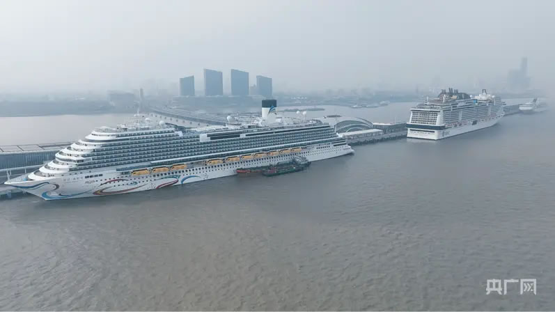 1月27日,吳淞口國(guó)際郵輪港迎來今年首次兩船同靠(央廣網(wǎng)發(fā) 陳鴻思 攝)