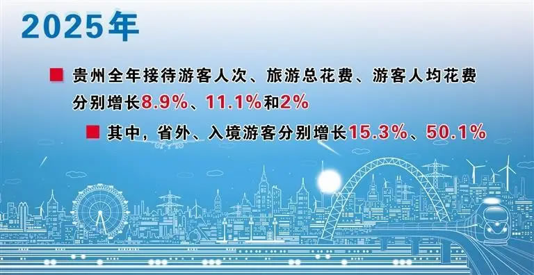 文旅市場的火熱,讓越來越多經營主體不斷跨界營業(yè),在文旅行業(yè)創(chuàng)新前進,與傳統(tǒng)旅游經營主體一起推動貴州旅游高質量發(fā)展。日前,記者從貴州省2025年經濟運行情況新聞發(fā)布會獲悉,2025年貴州全年接待游客人次、旅游總花費比上年分別增長8.9%、11.1%。另據(jù)省文旅廳數(shù)據(jù),省外、入境游客分別增長了15.3%、50.1%。