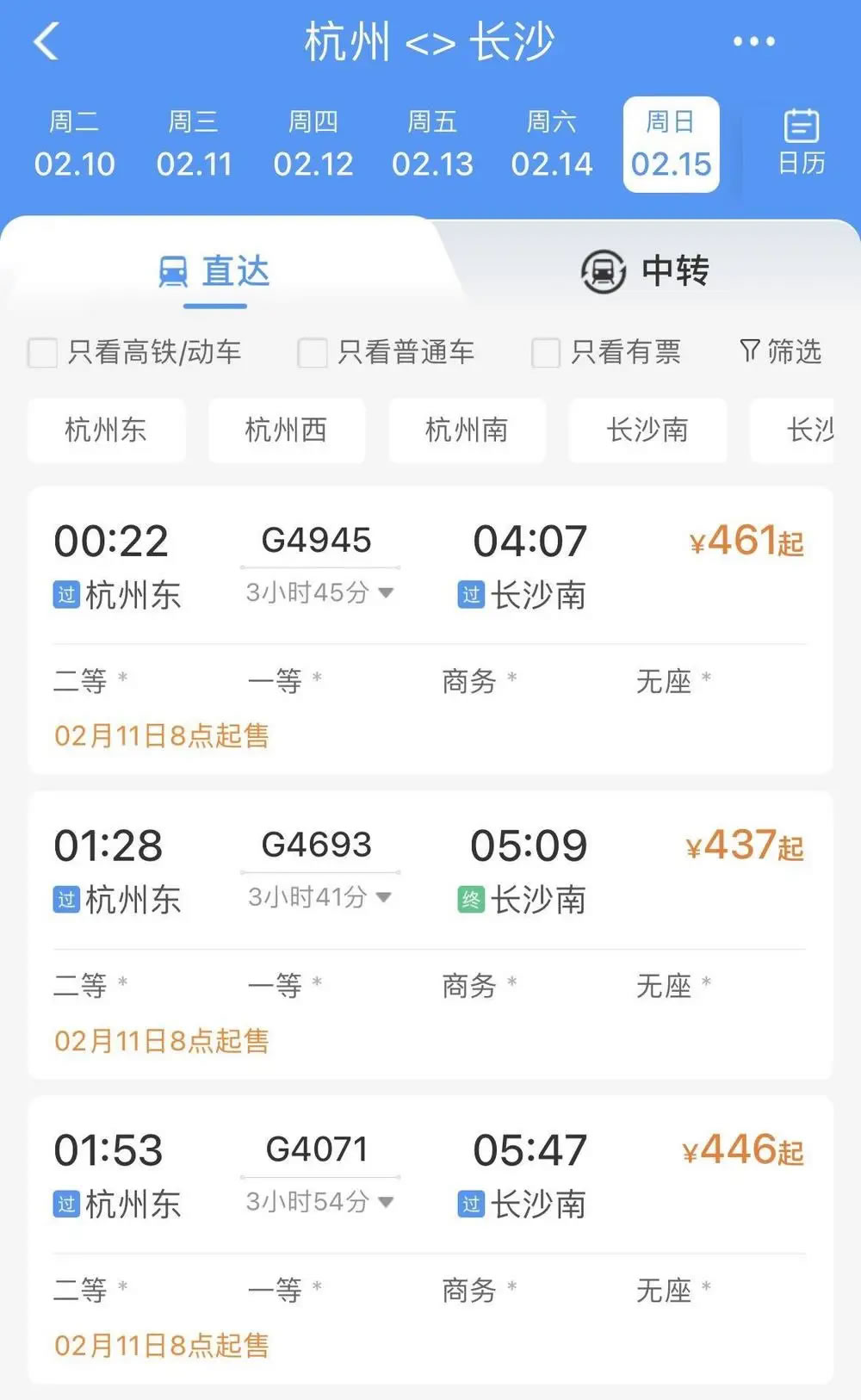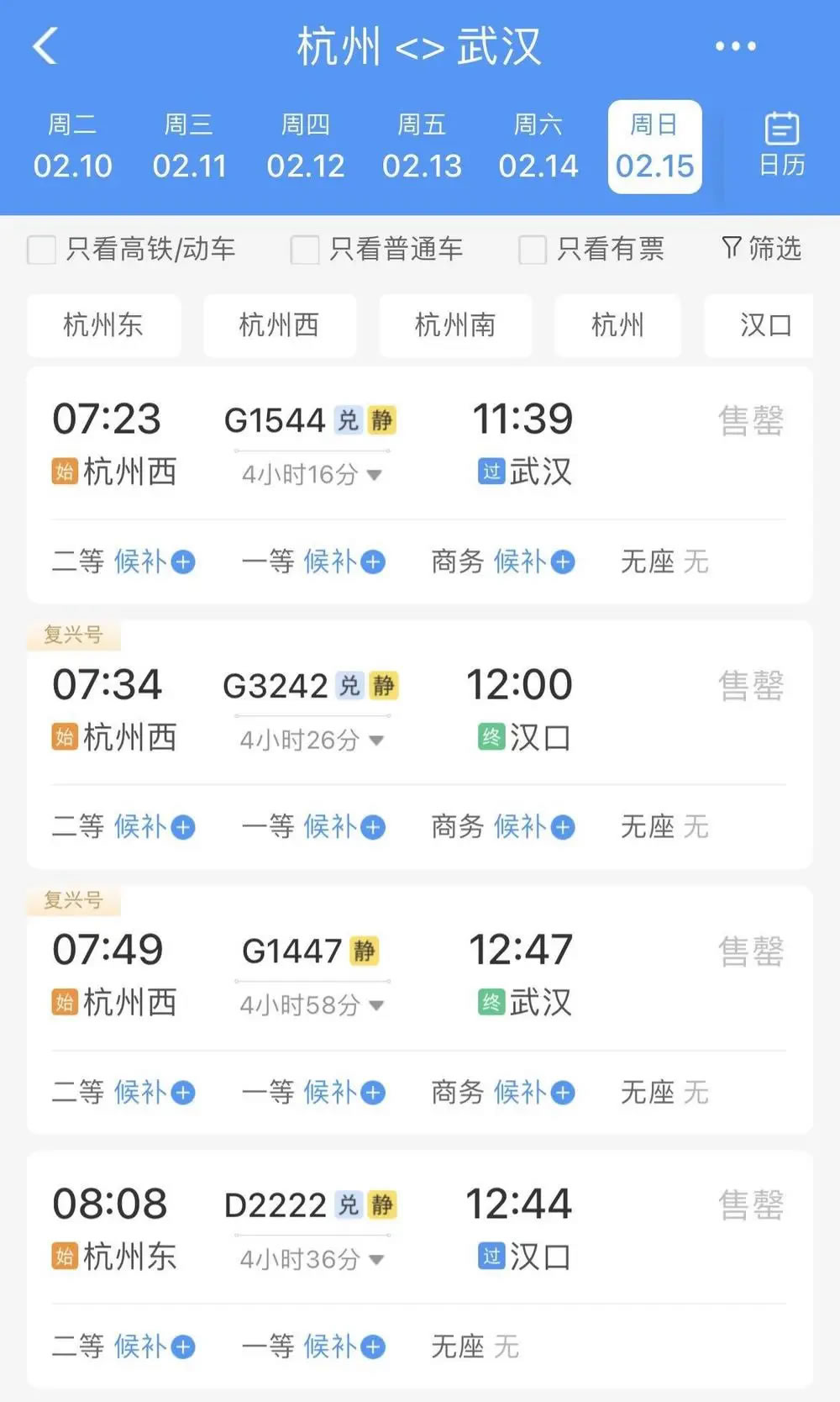 比如,2月15日杭州前往武漢、長(zhǎng)沙、南昌、貴陽(yáng)等地,無論是普速列車還是動(dòng)車組列車,當(dāng)天所有車次已經(jīng)基本全部售罄,只剩極個(gè)別車次硬座、無座席位還有余票。