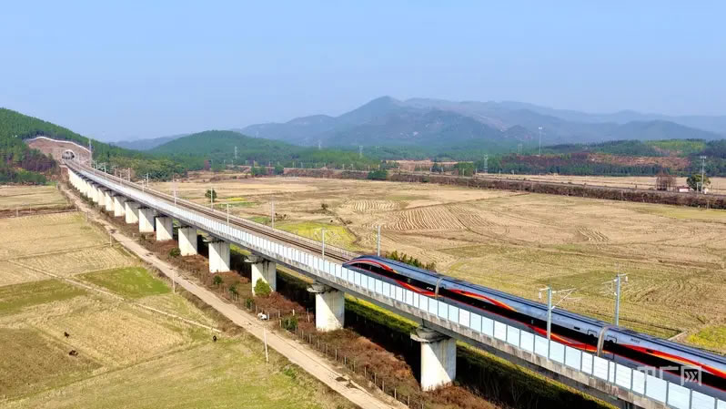 列車穿梭于田野山巒之間,構成一幅生動的高鐵春運圖景 (央廣網(wǎng)發(fā) 宋靖輝 攝)