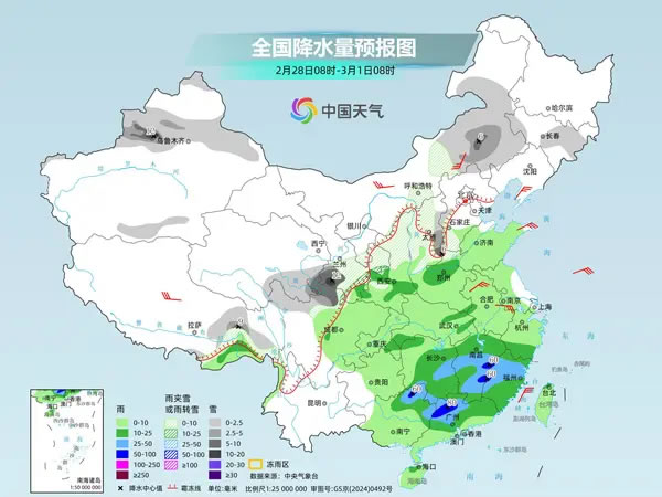 央視網(wǎng)消息:據(jù)中國天氣網(wǎng)消息,今天(2月27日),南方降雨范圍縮減,降雨重心南移至華南,部分地區(qū)有大雨。明后天,我國新一輪大范圍降水過程將接踵而至,江南、華南等地陰雨頻繁,需防范連續(xù)降雨對交通出行等方面的不利影響。受頻繁雨雪和冷空氣影響,未來幾天,北方氣溫多波動起伏,華北、東北部分地區(qū)氣溫偏低,需注意保暖。